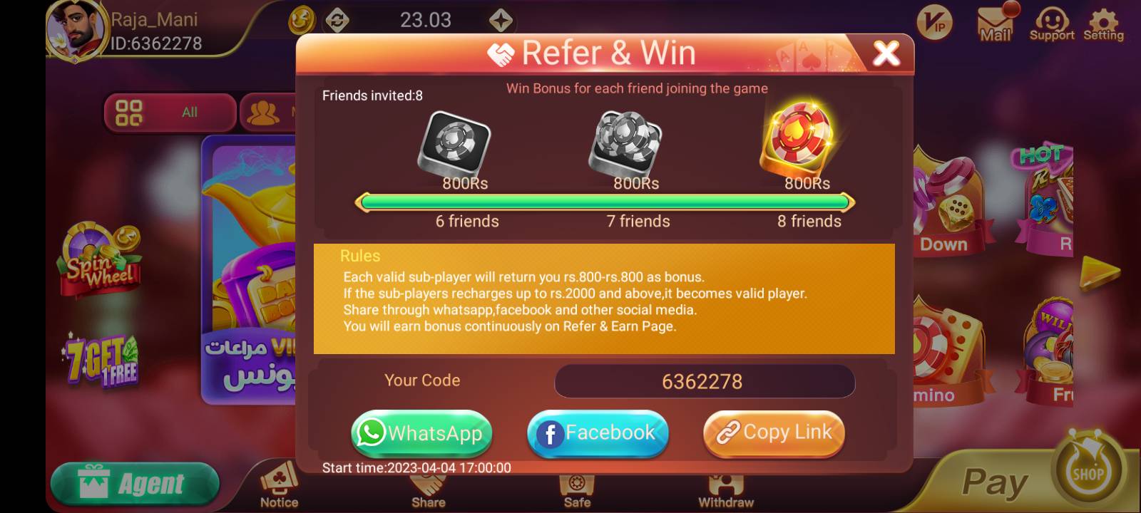 You can invite your friends and family by sharing your referral link through WhatsApp, Telegram, or Facebook. Each person who installs and deposits through your link gives you up to 30% commission.